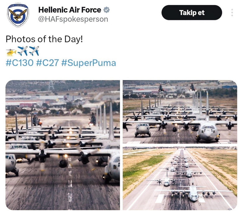 İlk kez kasım ayı başında yayınlanan Yunan C-130 tipi nakliye uçaklarının yer aldığı fotoğraflar, önceki gün Yunan Hava Kuvvetleri’nin sosyal medya hesaplarından yeniden paylaşıldı. Paylaşım infial yaratırken Ankara, tepkisini Atina’ya iletince fotoğraflar kaldırıldı ve yerine Yunan Hava Kuvvetleri Komutanı Korgeneral Dimosthenis Grigoriadis’in 12 Kasım’da Hava Kuvvetleri Komutanı Ziya Cemal Kadıoğlu’na gönderdiği taziye mektubuna yer verildi. Grigoriadis mektubunda “ Kelimeler, duyduğum derin üzüntüyü tarif edemez” ifadelerini kullandı.